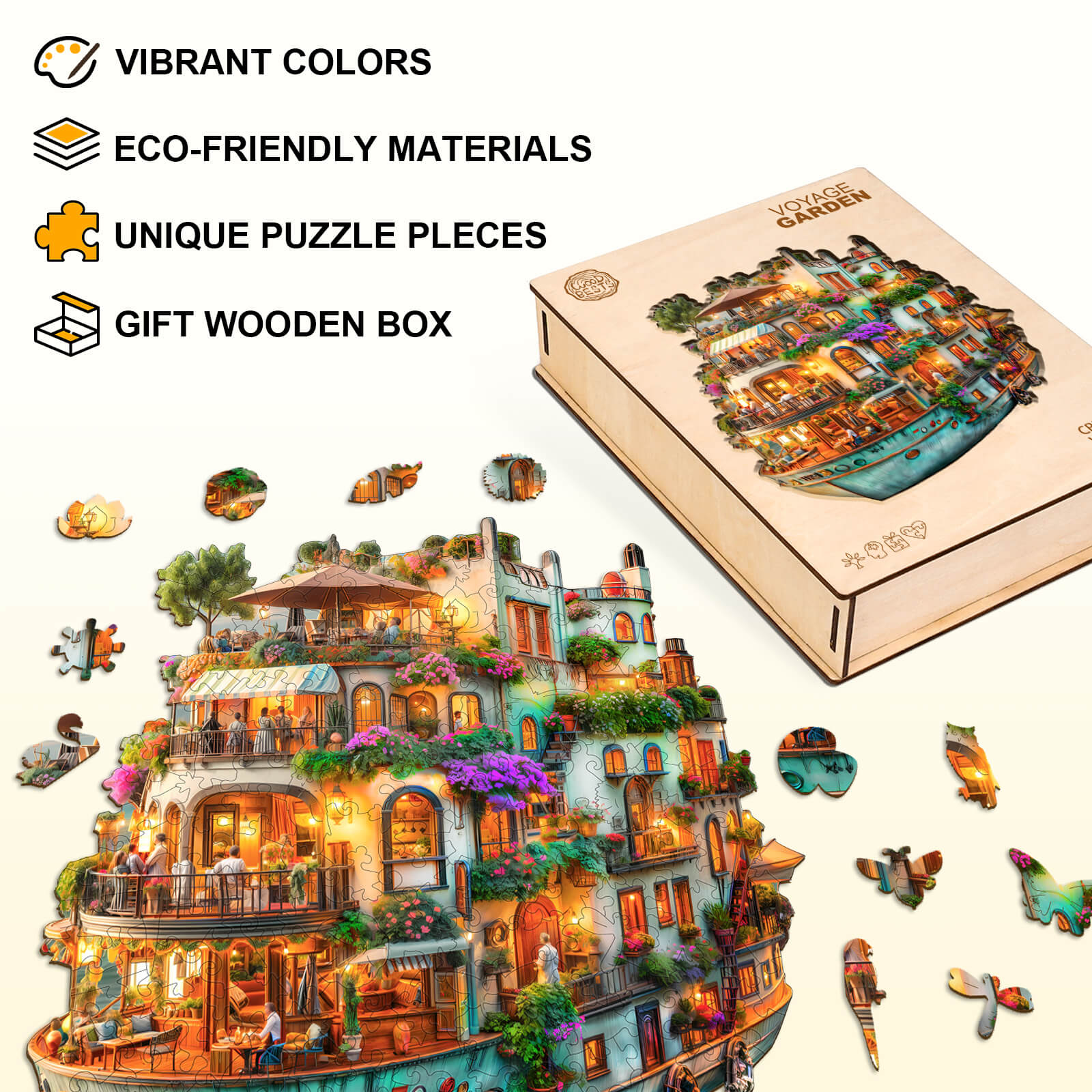 Voyage Garden Wooden Jigsaw Puzzle featuring vibrant colors, eco-friendly materials, unique pieces, and a gift wooden box.