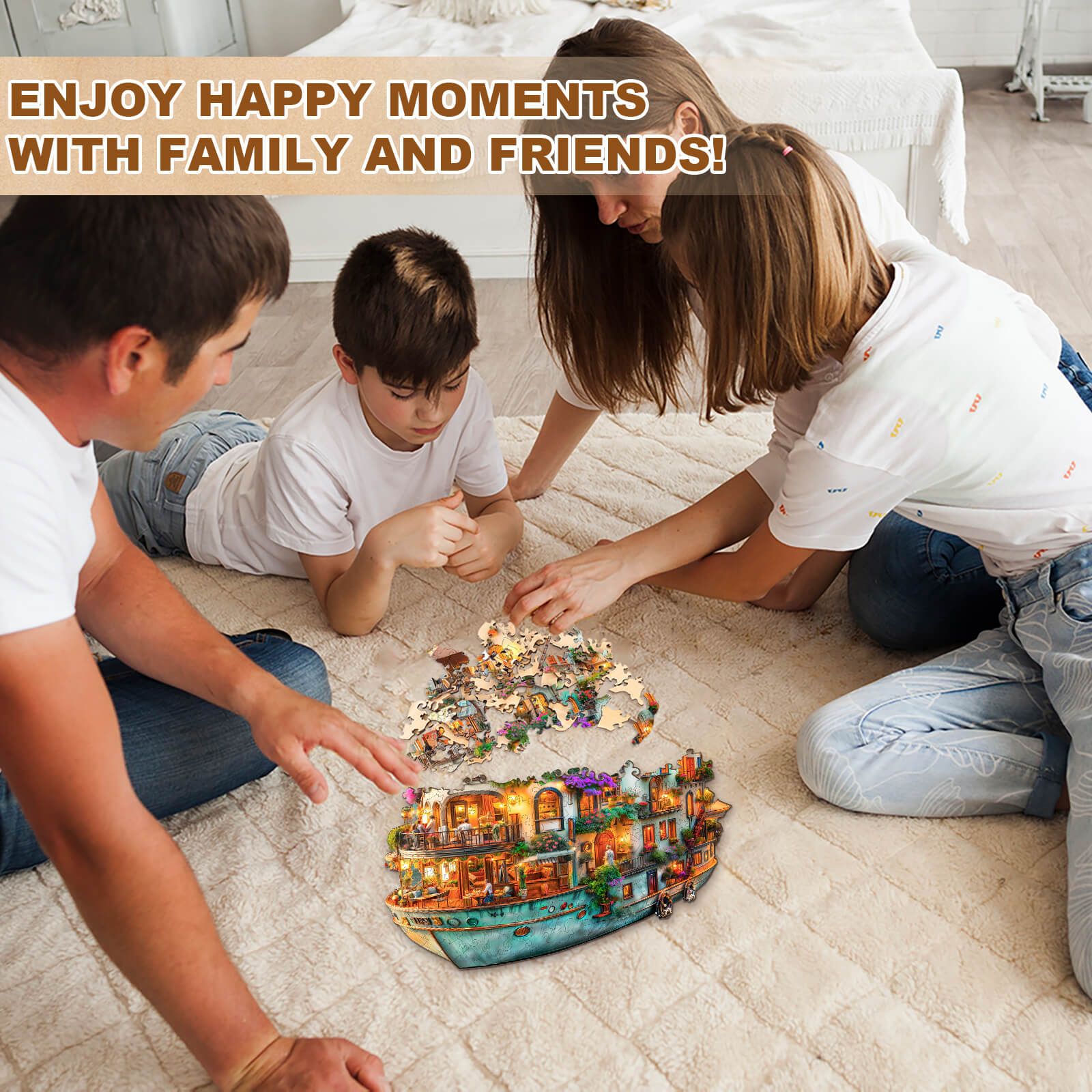 Family enjoying quality time together while assembling the Voyage Garden wooden jigsaw puzzle on a cozy floor.