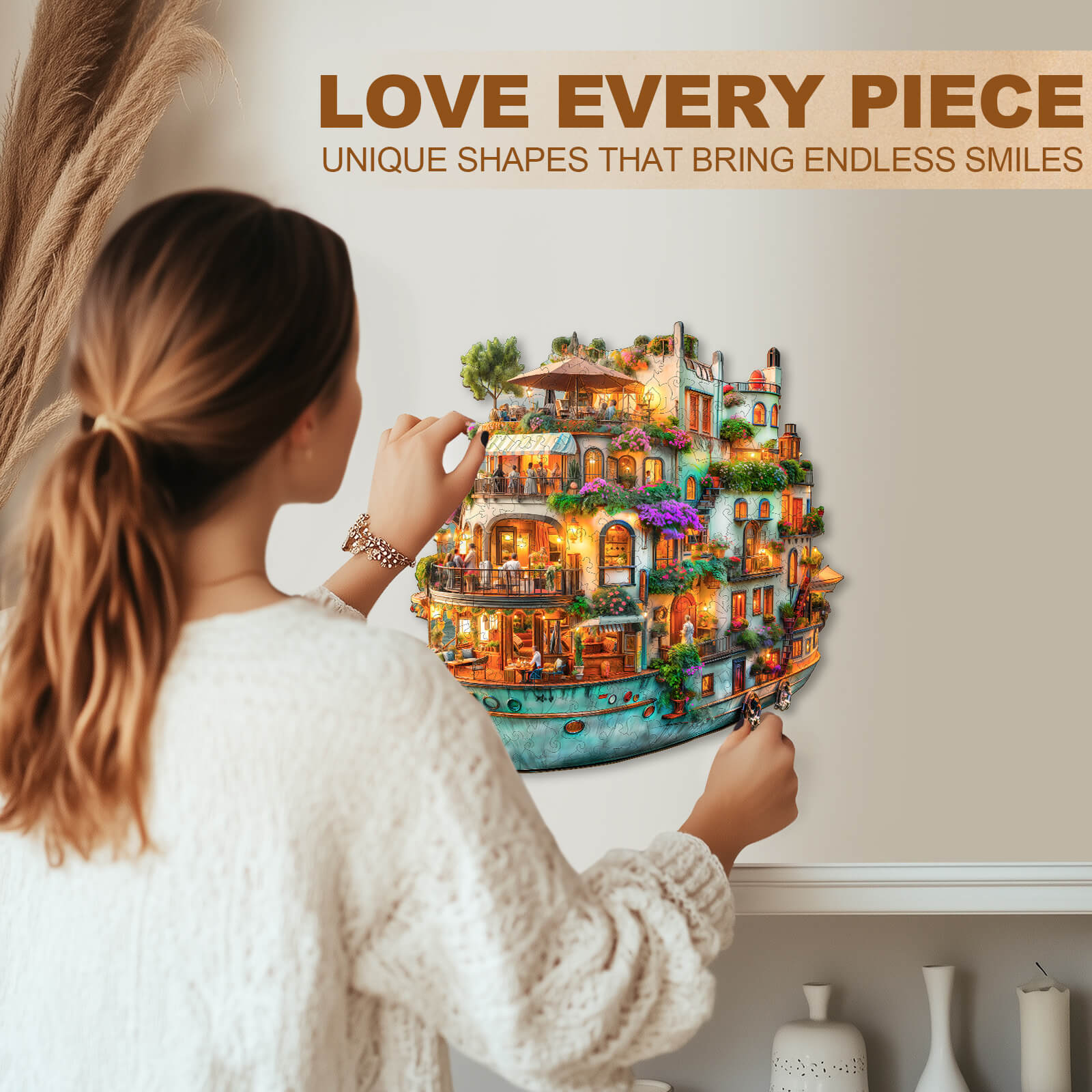 Voyage Garden Wooden Jigsaw Puzzle featuring a beautifully lit boat filled with flowers and cozy balconies.